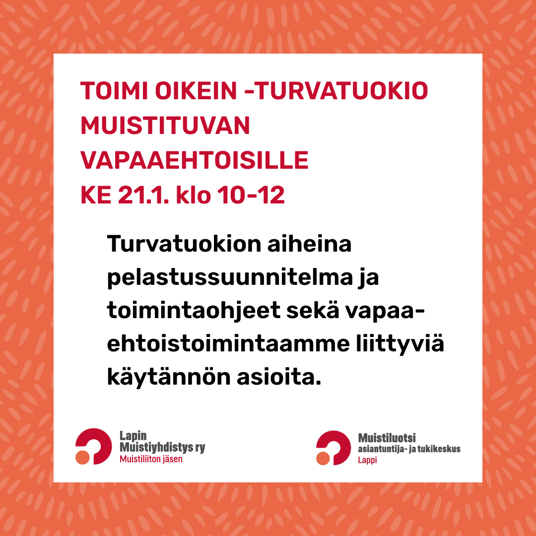 Turvatuokio on tarkoitettu Muistituvan vapaaehtoisten koulutushetkeksi. Turvatuokion aiheina ovat pelastussuunnitelma ja toimintaohjeet sekä vapaaehtoistoimintaamme liittyviä käytännön asioita.